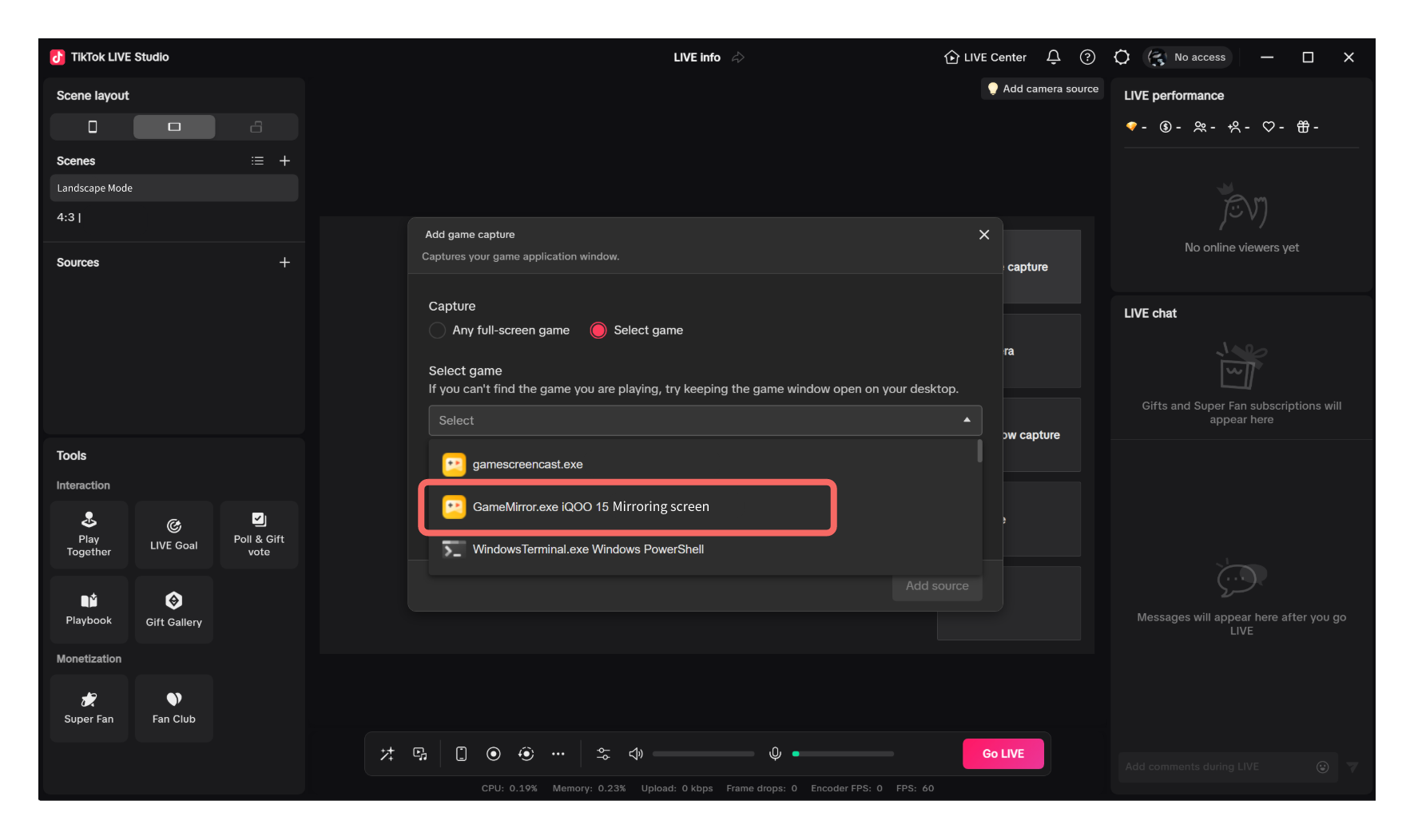 Prefer the game capture method. Choose Add display capture > Game capture and select GameMirror.exe Mirroring screen. If an error occurs, causing window content to be unable to display normally, go to step 3.