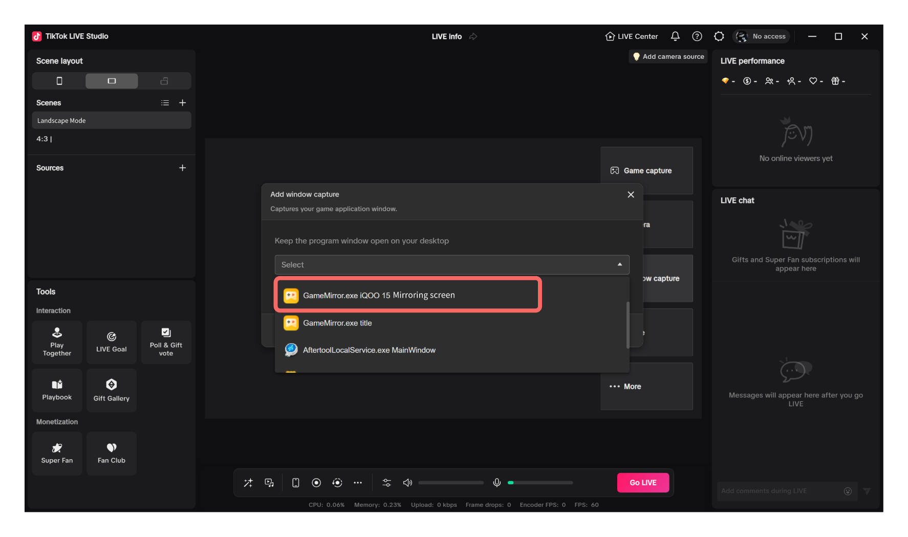 Choose Add display capture > Window capture, selectGameMirror.exe Mirroring screen,andconfigure other settings based on the streamer's preference.